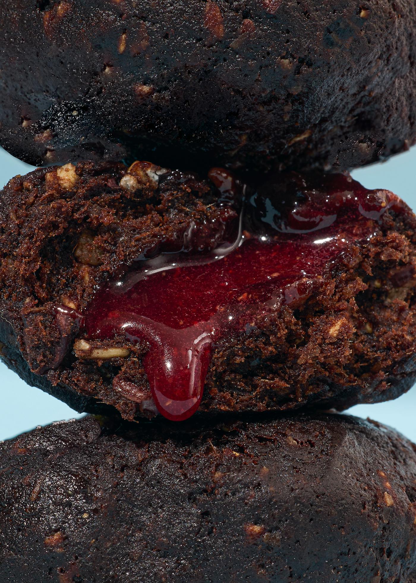 - Mit Haselnussmus- und Himbeer-Fruchtfüllung