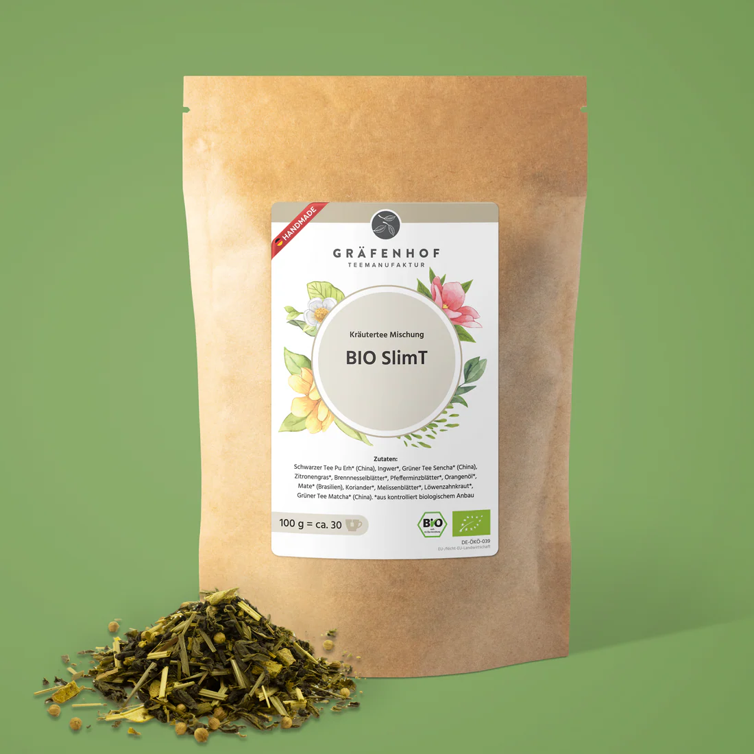Die Teemischung BIO SlimT vereint die jahrtausendealten Traditionen der Teekultur Chinas und Brasiliens in einem einzigartigen Geschmackserlebnis. Die Schwarz- und Grünteesorten stammen aus den besten Anbaugebieten Chinas, wo Tee seit über 4000 Jahren angebaut und verarbeitet wird. Der Mate, ein traditionelles Getränk in Brasilien, bringt eine erfrischende und belebende Note in die Mischung. Die sorgfältig ausgewählten Kräuter und Gewürze runden den Geschmack ab und verleihen dem Tee seine gesundheitsfördernden Eigenschaften. Leider sind wir als Hersteller sehr eingeschränkt, was die gesundheitlichen Aussagen betreffen. Aus diesem Grund findest du oft sehr wenige Informationen über Wirkungen und Benefits unserer Produkte.