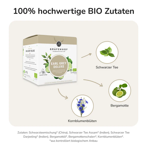 Schwarzteemischung* (China), Schwarzer Tee Assam* (Indien), Schwarzer Tee Darjeeling* (Indien), Bergamottöl*, Bergamottenschalen*, Kornblumenblüten*. *aus kontrolliert biologischem Anbau