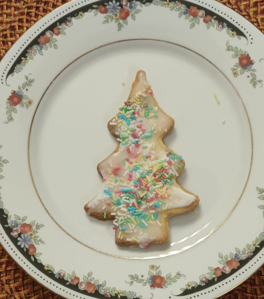 Frische Buttergebäck Tannenbäume 10x6 cm mit Zitronenglasur und bunten Streusel