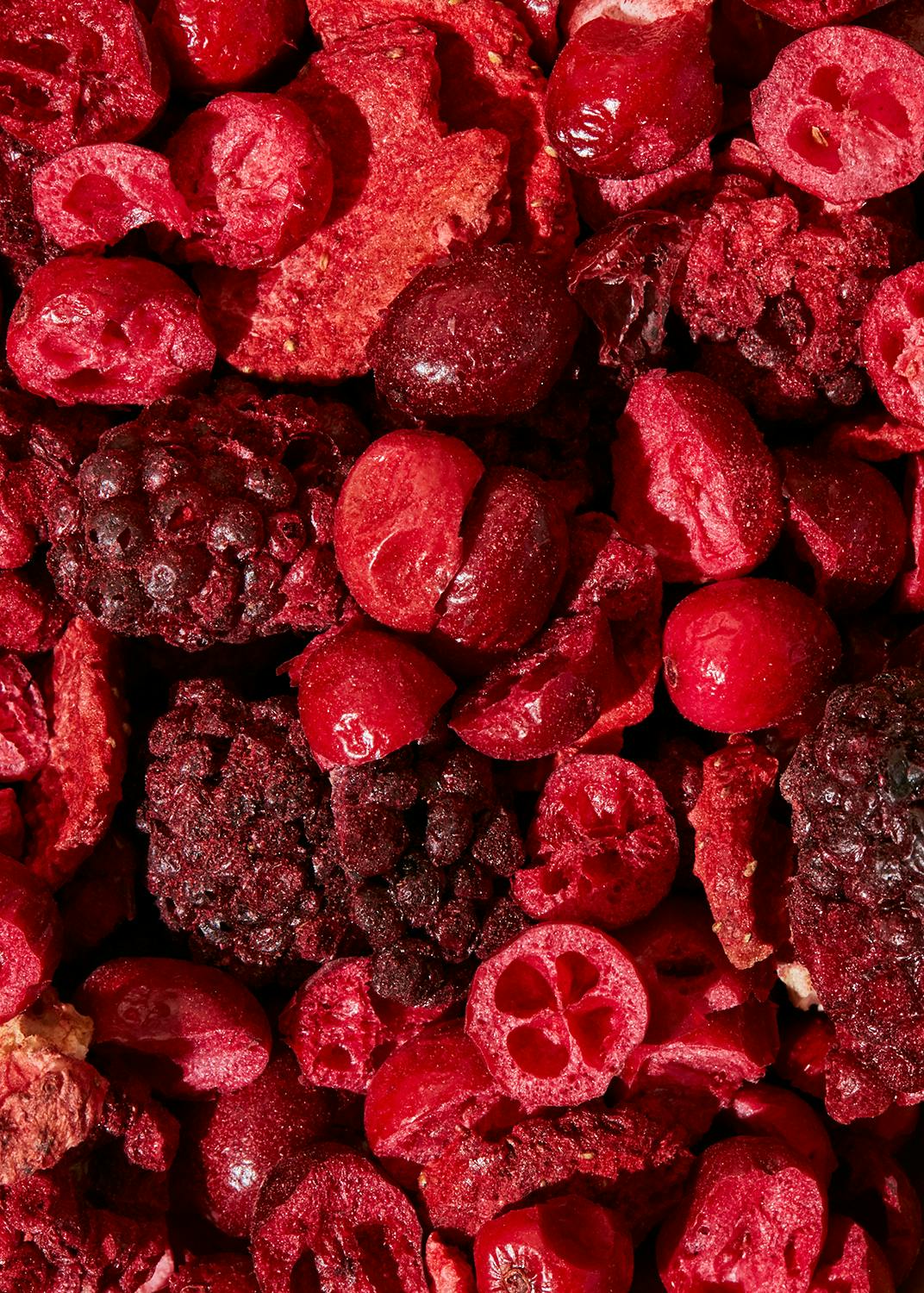 In unserer Beerenmischung treffen unterschiedliche Geschmäcker aufeinander und ergeben ein wahres Geschmackserlebnis! Die angenehme Süße der Erdbeere, die feine Säure der Brombeeren und die herbe Note der Cranberry passen zusammen wie KoRo und Du! Dabei sind die Beeren (und Sammelfrüchte, pardon) gefriergetrocknet und sehen deshalb immer noch zum Anbeißen aus. Aber nicht nur das. Der Prozess der Gefriertrocknung hat neben der unversehrten Optik weitere Vorteile: Durch die schonende Herstellung bleibt ein Großteil der Nährwerte erhalten. Als wenn das noch nicht genug wäre, punktet der gefriergetrocknete Beeren-Mix mit seinem hohen Ballaststoffgehalt und der Konsistenz: crispy und crunchy – ideal als Topping und als Snack! Findest Du die Gefriertrocknung auch so cool wie wir? Aus diesem Grund haben wir eine ganze Menge an gefriergetrockneten Früchten in unserem Sortiment. Du findest neben gefriergetrockneten Granatapfelkernen oder roten Johannisbeeren auch Kompositionen aus gefriergetrockneten Früchten und Schokolade: Wie wär's mit gefriergetrockneten Himbeeren in Vollmilchschokolade oder Erdbeeren in weißer Schokolade?!