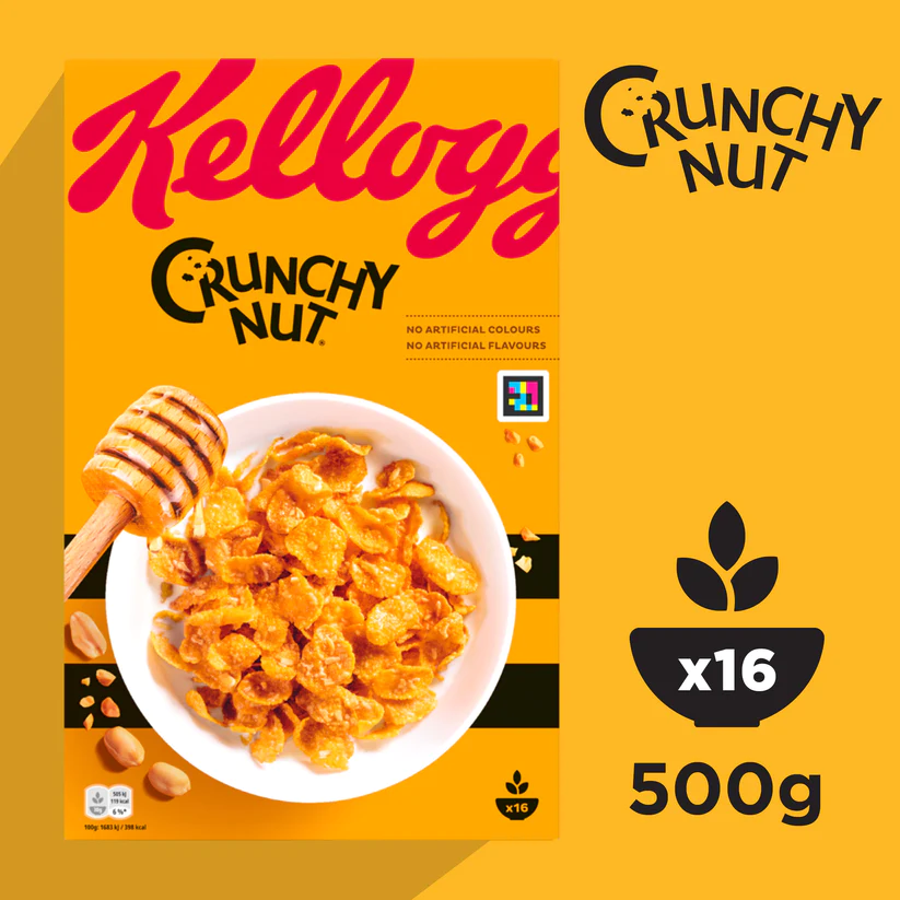 Mit einem nussigen Duft und der Süße von Honig und gerösteter Erdnuss sorgen die Crunchy Nut Cornflakes mit jedem Bissen für einen kleinen Genussmoment. Die goldenen Mais Cornflakes mit knackigen Erdnussstücken entfalten ihr Aroma in der Milch – ein Geschmackserlebnis für alle Sinne.