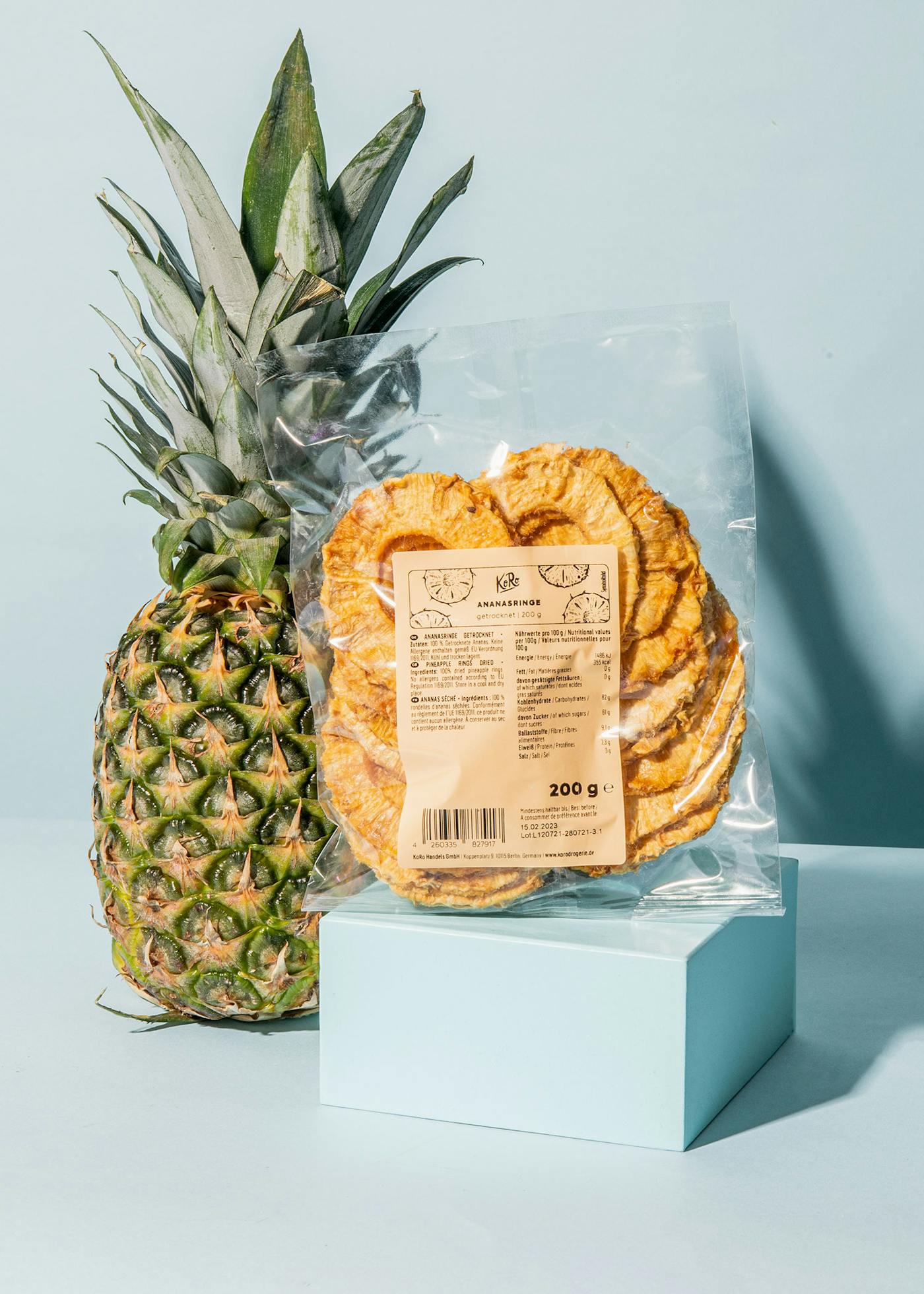 Die Ananas stammt aus der Familie der Bromeliengewächse (Bromeliaceae) und kommt ursprünglich aus Amerika. Heutzutage wird sie, nicht zuletzt wegen der hohen Nachfrage, weltweit in den tropischen Gebieten als Obstpflanze kultiviert. Die Ananas braucht eine Temperatur von 24–30 Grad Celsius. Liegt die Temperatur unter 20 Grad verlangsamt sich das Wachstum deutlich. Während der Fruchtreife können bereits Temperaturen unter 21 Grad zu Reifungsstörungen führen, die sich durch braune Flecken äußern. Weiterhin sollte die Luftfeuchtigkeit bei etwa 60 Prozent liegen. Du kannst Dir also wahrscheinlich denken, dass sich der eigene Anbau von Ananas im Zimmer oder gar draußen als schwierig entpuppt. Umso besser, dass Du Dir diesen Aufwand sparen kannst und unsere getrockneten Ananasscheiben aus Costa Rica direkt genießen kannst.