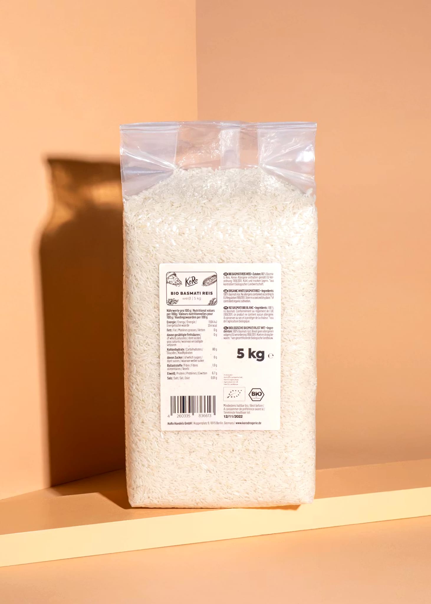 Ach, Reis, wir sind ihm schon fast etwas schuldig. Er begleitet uns seit jeher in unserem Lieblingsessen, angefangen mit Milchreis in der Kindheit, über den roten Reis im Griechenlandurlaub, durch die Risotto-Versuche in der WG-Küche bis hin zum Sushi-Restaurantbesuch. Wegen dieser zahlreichen Erinnerungen und Möglichkeiten haben wir uns gedacht, da muss eine besonders große Größe her. Kauf jetzt unseren Bio-Basmatireis in der 5 kg-Vorteilsgröße und genieße Reis, so viel und wann Du möchtest!