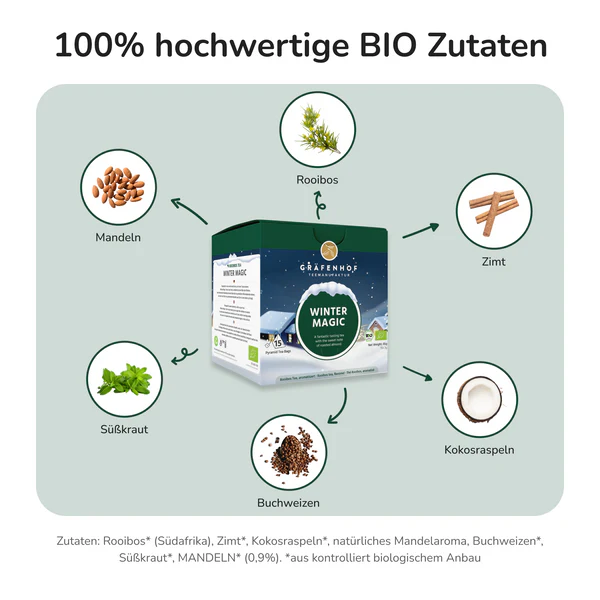 Rooibos* (Südafrika), Zimt*, Kokosraspeln*, natürliches Mandelaroma, Buchweizen*, Süßkraut*, MANDELN* (0,9%). *aus kontrolliert biologischem Anbau